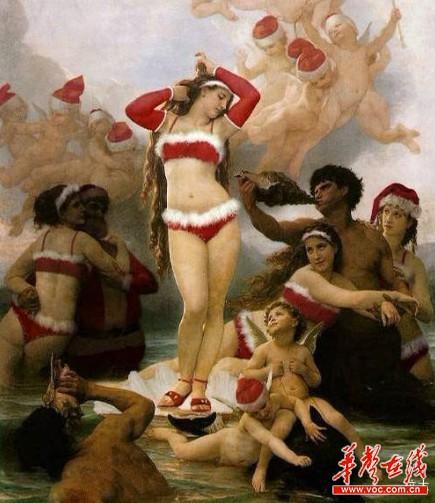名畫《維納斯的誕生》也慘遭惡搞,這幅來(lái)自15世紀(jì)后半葉,佛羅倫薩畫派、藝術(shù)大師波提切利創(chuàng)作的畫作也未能幸免。原畫中優(yōu)美動(dòng)人、線條婀娜的維也納“一秒之內(nèi)變舞娘”。變裝后的維納斯穿上了紅白搭配的內(nèi)衣,腳上也穿著紅色的高跟鞋,瞬間變?yōu)橐粋€(gè)夜店舞娘的形象,還嫵媚地?fù)崦约旱拈L(zhǎng)發(fā),身后的人群也穿戴得如同在慶祝圣誕節(jié)。