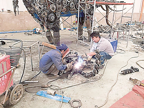 設計者田國鑫畢業(yè)于西北民族大學藝術設計系,現(xiàn)擔任該公司鐵藝車間經(jīng)理。作為一名90后的男生,他從小就是看著《變形金剛》長大的,他獨愛鐵藝設計,對那些大黃蜂、擎天柱等角色有著很深的感情,他有他獨特的設計風格和創(chuàng)作手法。在他眼睛里,我們身邊并沒有任何所謂的廢棄物,有的只是面對廢棄物所短缺的設計靈感。田國鑫告訴記者,經(jīng)過一段時間摸索,目前園區(qū)制作出的鐵藝產(chǎn)品種類豐富,形態(tài)各異,制作一個大型鐵藝術產(chǎn)品,兩個人只需要半月時間便可完成。