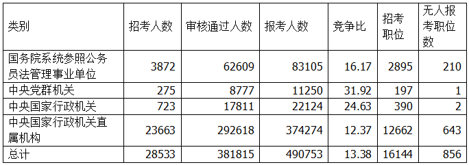 國稅是招錄大戶,目前共有19萬人通過審核,共有24萬人報(bào)名,競爭比為11:1,仍有367個(gè)職位無人報(bào)考。鐵路公安審核通過人數(shù)位居第二,目前有2.5萬人通過審核,競爭比為16:1。值得關(guān)注的是,國家物資儲備局雖然招錄人數(shù)不是很高,僅有51人,但目前有4236人報(bào)名,3554人通過審核,競爭比高達(dá)70:1。