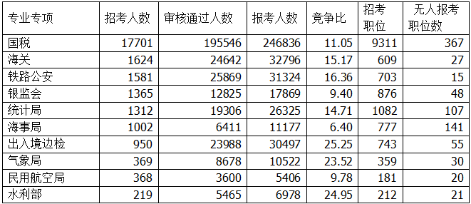 國稅報(bào)名人數(shù)最多,國家物資儲備局競爭大。