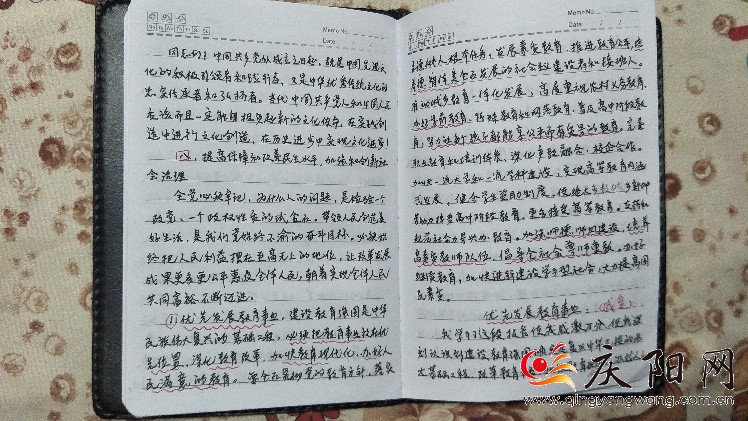 ????把不到兩歲的小孫子哄睡著,包秀梅歇了口氣。趁著這段空閑,她拿出學習資料和筆記本,戴上老花鏡,坐在書桌前,繼續(xù)抄寫黨的十九大報告,每抄一小部分,緊接著寫下所思所悟?;蛞粌删湓?,或百千字,不時還用紅筆標注出要點。這樣一絲不茍記的筆記,包秀梅也不記得寫了多少本了。