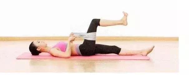 平躺,膝蓋彎屈,腳平放于地。伸出左腿,套入伸縮拉帶或毛巾,雙手抓住拉帶兩端。用拉帶把腿拉向胸前,再用力將小腿伸直,保持10至30秒,以鍛煉小腿肌肉和腳筋。重復(fù)該動作3至5次,然后換腿。