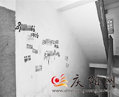 西峰區(qū)馬蓮河大道一小區(qū)樓道內(nèi)墻上噴涂的小廣告