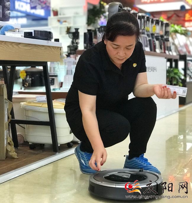 西峰區(qū)某電器城工作人員操作演示智能掃地機器人