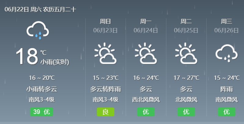 ????6月22日白天,慶陽大部將會有持續(xù)的小雨,到夜間雨晴后轉為陰間多云;
