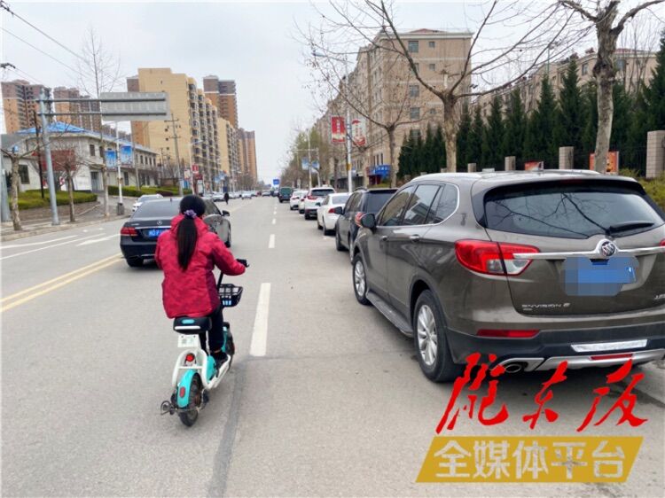 順化東路市財(cái)政局段,道路一側(cè)停滿了車(chē),騎車(chē)經(jīng)過(guò)這里只能走機(jī)動(dòng)車(chē)道