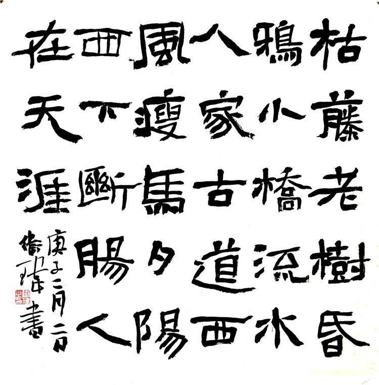 衛(wèi)瑋的楷書以魏碑為主,多取法《元騰墓志》、《元略墓志》等。另外,他對碑刻、造像、摩崖均有涉獵,這些工作豐富了楷書書寫中的用字以及情趣。他的小字作品以墓志為主,用遒勁的線條,表現出一派清雅之風。他的大字作品把碑刻、造像、摩崖結為一體,將碑刻的嚴謹端莊、造像的方雄質樸、摩崖的渾穆奔放融合得妥妥帖帖,短長合度,同時又不乏通脫靈秀。他的行草書多擬二王,小字作品空靈典雅,流動著秀麗的書卷氣。大字作品沉澀樸實,大氣中展現著生動磅礴。