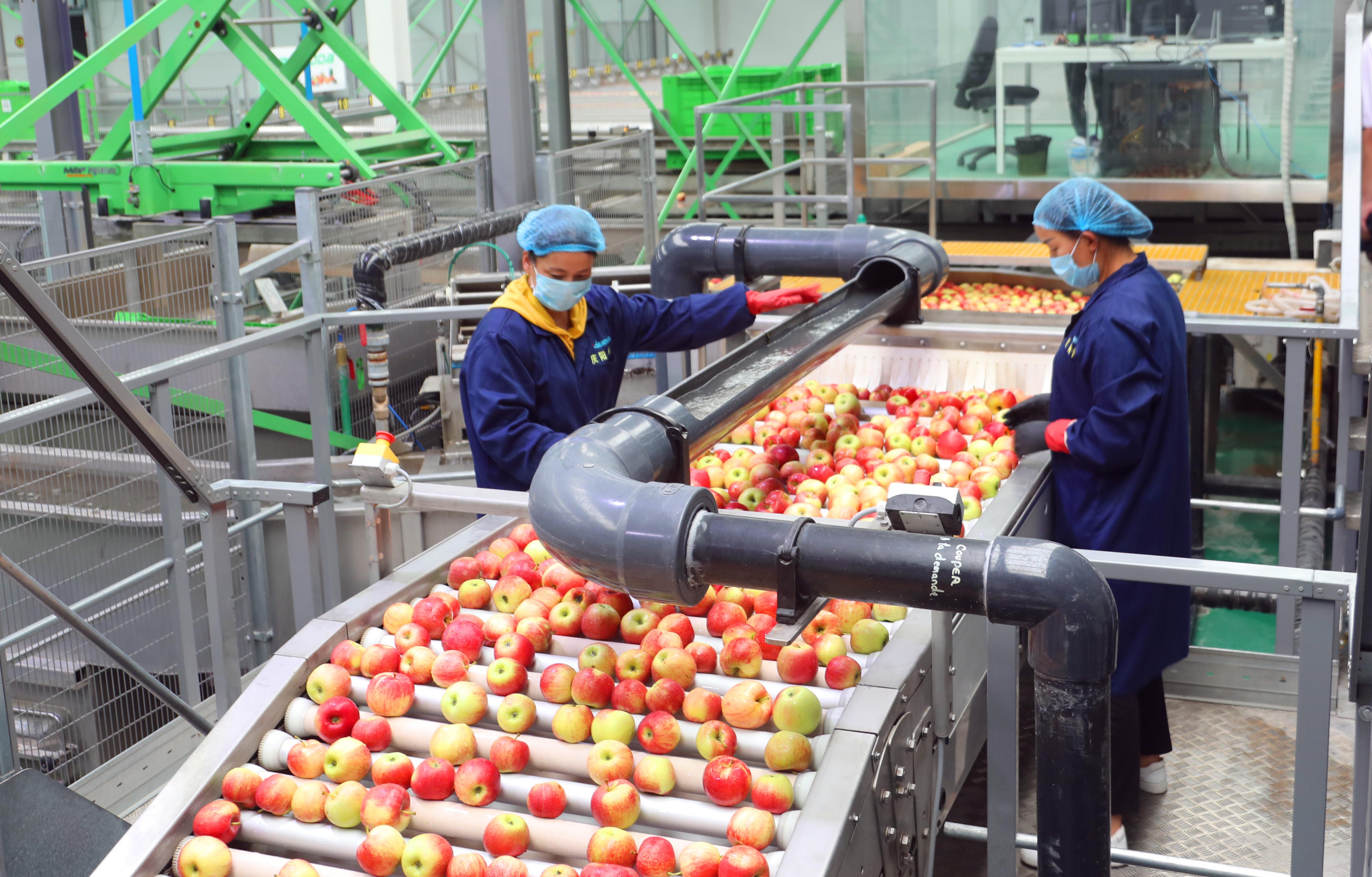 慶陽海越蘋果分揀線工人在分揀蘋果(2020年7月23日攝)