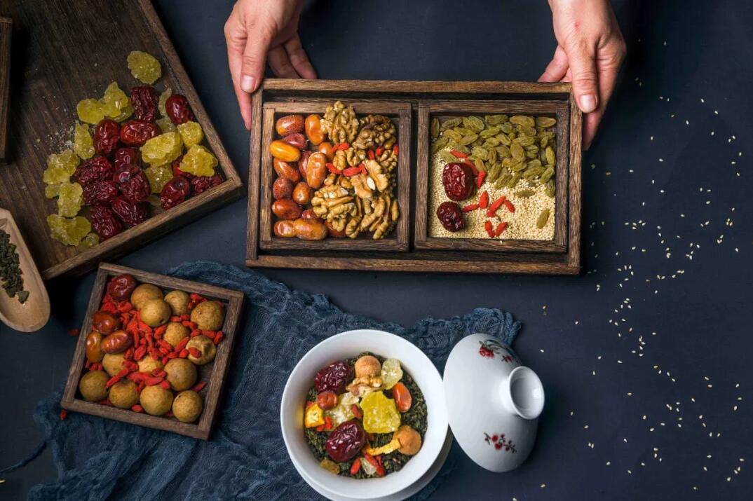 在寧夏吃肉,必須得配一碗蓋碗八寶茶。蓋碗茶是回族傳統(tǒng)茶飲?;刈迦罕姾炔桀H有講究,既不叫飲茶,也不叫喝茶,而是叫“刮碗子”?;刈迮萆w碗茶需用滾燙的開水沖下碗,然后放入茶葉和紅棗、枸杞、核桃仁桂圓、芝麻、葡萄干、果脯等配料。養(yǎng)生又解乏,在銀川高鐵站下車后,一定要去嘗一嘗。