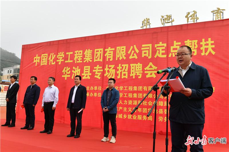 2020年8月19日,邱軍(右一)參加中國(guó)化學(xué)定點(diǎn)幫扶華池縣專場(chǎng)招聘會(huì)并致辭。