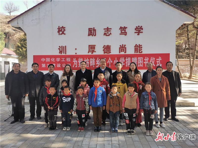 邱軍(后排右五)銜接中國(guó)化學(xué)第九建設(shè)公司為華池縣紫坊畔鄉(xiāng)一小學(xué)捐贈(zèng)圖書(shū)。