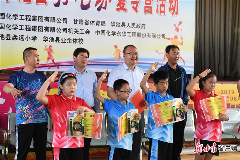 2020年8月20日,邱軍(后排右二)參加中國(guó)化學(xué)華池縣羽毛球夏令營(yíng)活動(dòng)并向小朋友頒獎(jiǎng)。