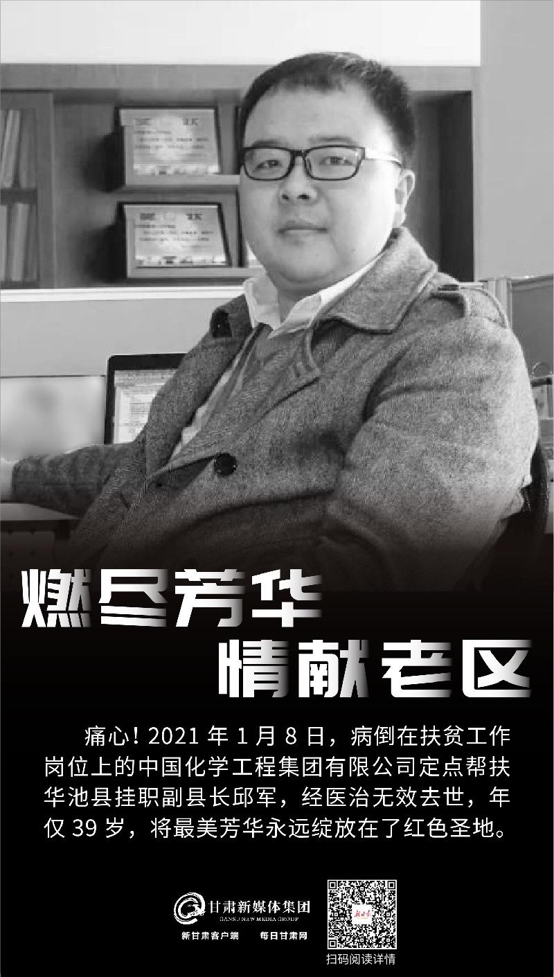 2021年1月8日下午,因搶救無(wú)效,中國(guó)化學(xué)工程集團(tuán)有限公司定點(diǎn)幫扶華池縣掛職副縣長(zhǎng)邱軍,永遠(yuǎn)地離開(kāi)了熱愛(ài)的華池土地,年僅39歲。