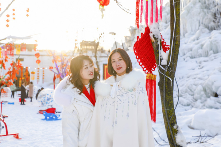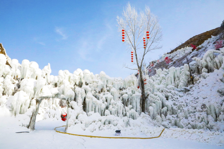 景點(diǎn)內(nèi)一片銀裝素裹,樹木上懸掛起大紅燈籠和中國結(jié),營造起了濃濃年味。