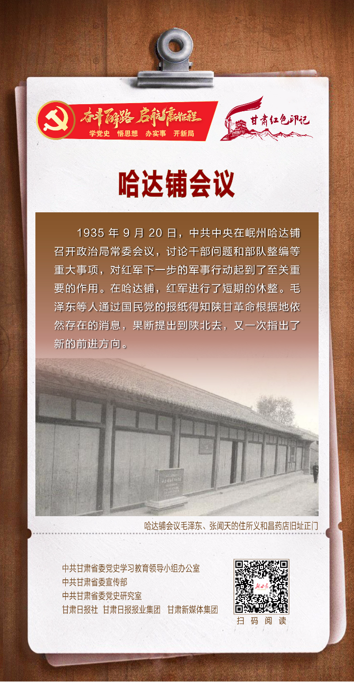 9月22日,在哈達(dá)鋪關(guān)帝廟召開(kāi)的全軍團(tuán)以上干部會(huì)議上,毛澤東宣布了黨中央關(guān)于組成陜甘支隊(duì)的決定,并代表黨中央作了關(guān)于形勢(shì)和任務(wù)的政治報(bào)告,正式宣布紅軍陜甘支隊(duì)將向陜甘革命根據(jù)地進(jìn)發(fā)。毛澤東說(shuō),感謝國(guó)民黨的報(bào)紙為我們提供了比較詳細(xì)的陜北紅軍消息,那里不但有劉志丹的紅軍,還有徐海東的紅軍,還有根據(jù)地!我們要抗日,首先要到陜北去!毛澤東號(hào)召全體指戰(zhàn)員:“勝利前進(jìn)吧,到陜北只有七八百里了,那里就是我們的目的地,就是我們的抗日前進(jìn)陣地!”毛澤東的報(bào)告,使紅軍指戰(zhàn)員受到極大鼓舞,高呼“擁護(hù)中央北上抗日的正確路線!”“到陜甘革命根據(jù)地去!”表現(xiàn)出紅軍將士北上抗日的堅(jiān)強(qiáng)決心。