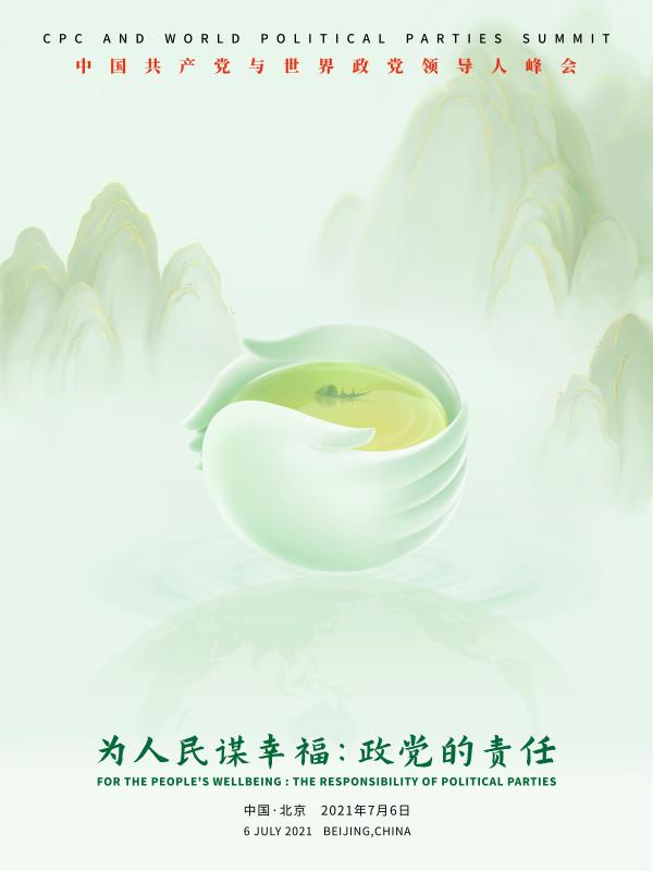 海報(bào)《同舟共濟(jì)》的主體圖案是一只由緊扣的雙手組成的青玉茶杯。溫潤的雙手環(huán)抱一泓清水,一葉小舟在碧色的山巒間游弋?!半p手”象征政黨對(duì)人民幸福的守護(hù)呵護(hù),“山巒中的茶杯”象征“志合者,不以山海為遠(yuǎn)”的理念,“小舟”象征同舟共濟(jì)的人類命運(yùn)共同體精神,旨在呼應(yīng)習(xí)近平總書記在慶祝中國共產(chǎn)黨成立100周年大會(huì)上“中國共產(chǎn)黨關(guān)注人類前途命運(yùn),同世界上一切進(jìn)步力量攜手前進(jìn)”的講話精神,展現(xiàn)中國共產(chǎn)黨同世界各國政黨一道、攜手建設(shè)美好世界的生動(dòng)圖景,體現(xiàn)人民幸福與政黨責(zé)任的峰會(huì)主題。