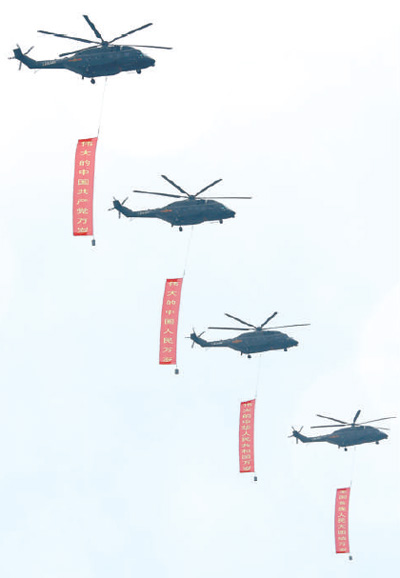 表演伊始,由7架直升機組成的空中護旗梯隊?wèi)覓禳h旗和四面巨幅標語,率先通過天安門廣場上空。四幅標語上分別寫著“偉大的中國共產(chǎn)黨萬歲”“偉大的中國人民萬歲”“偉大的中華人民共和國萬歲”“全國各族人民大團結(jié)萬歲”。