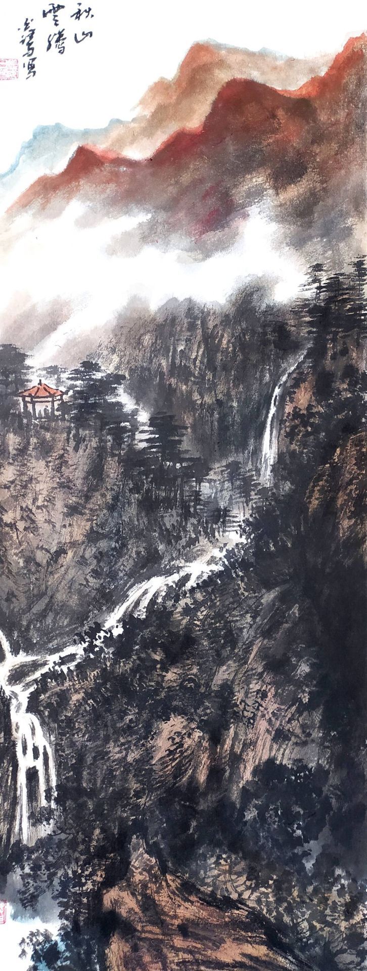 孟老師的山水畫具有強烈的個人色彩,它是畫家基于寫生的心靈印記,由于常在鄉(xiāng)間行走,也曾深居山寺,對黃土高原地貌的深厚感情,加之大量的專業(yè)創(chuàng)作,形成了其獨具匠心的繪畫面貌。身處其間,他的中國畫筆墨技法提升了新的層次,山水的自然之美與人的內(nèi)在精神渾然一體。