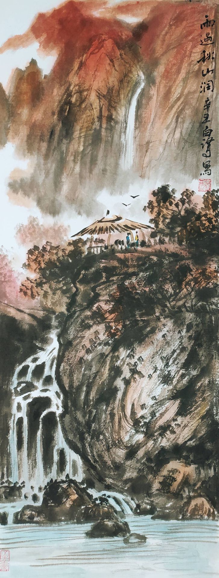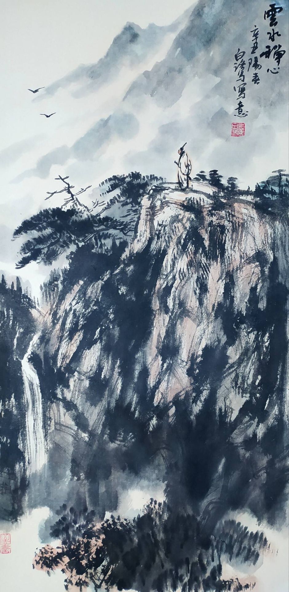 “寶劍鋒從磨礪出,梅花香自苦寒來?!焙玫睦L畫作品本身便是無聲的宣告,多年筆耕不輟的孟老師苦研讀,居鄉(xiāng)舍,深刻體悟五岳名川之精髓,他筆墨含凝,墨色生發(fā),細細品之,無論是山水亦或花鳥都筆酣墨飽,揮灑淋漓,山石肌理縱橫,濃墨恣肆,兼施干擦,大場景的山脈大氣磅礴,筆法多樣,小品式的山巒深遠清逸,韻致雅潔。