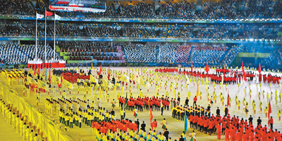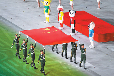 20時,儀仗隊員護擁五星紅旗健步走入體育場。會旗方陣過后,各代表團依次入場,此起彼伏的歡呼、自信陽光的笑容,在體育場中飛揚。