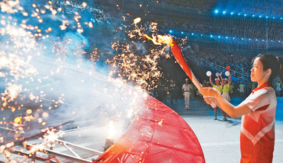 開幕式火炬手楊倩點燃第十四屆全運會主火炬。