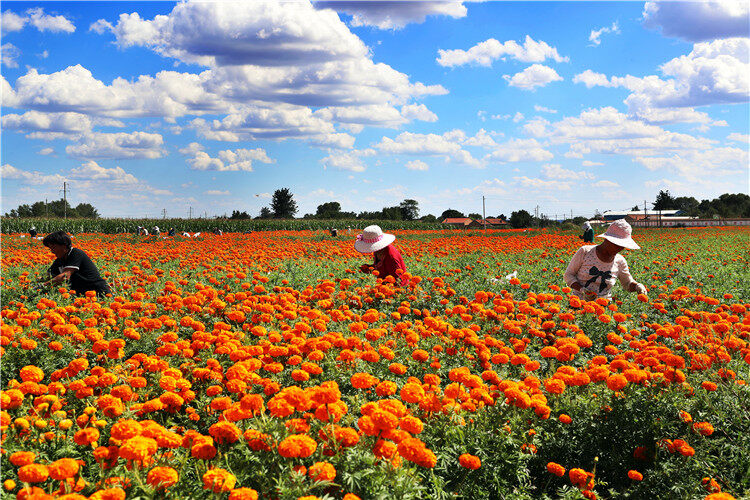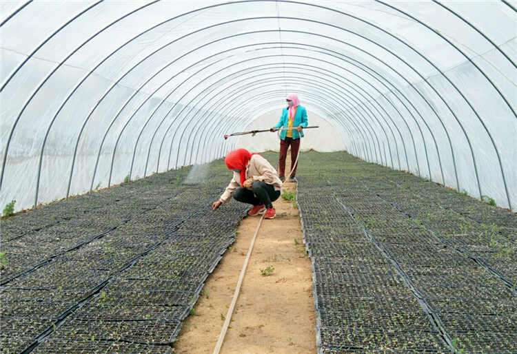 2020年4月27日,工人們正在環(huán)縣八珠鄉(xiāng)八珠塬村的60座規(guī)?;羞B片示范棚內(nèi)檢查萬壽菊幼苗長(zhǎng)勢(shì),進(jìn)行拔草、灑水作業(yè)。