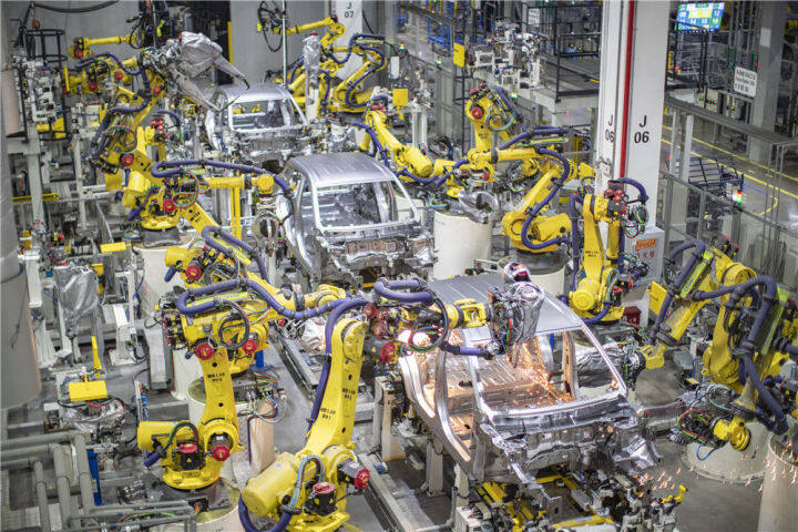 重慶一家新能源汽車企業(yè)使用智能化焊接機器人進行焊接作業(yè)(2021年4月2日攝)。新華社記者 黃偉 攝