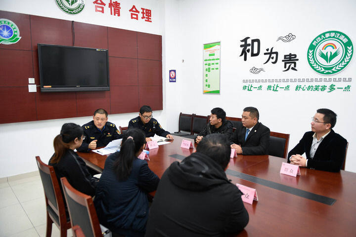 浙江省湖州市吳興區(qū)綜合行政執(zhí)法局龍泉中隊在“陽光調(diào)解室”進(jìn)行調(diào)解工作(2018年11月14日攝)。新華社記者 黃宗治 攝