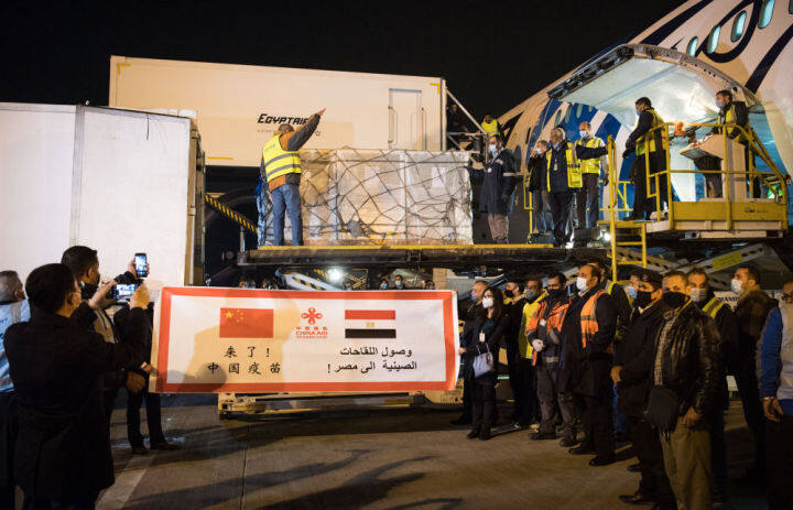 2021年2月23日,中國援助埃及的首批新冠疫苗抵達(dá)埃及開羅國際機(jī)場(chǎng)。新華社記者鄔惠我攝