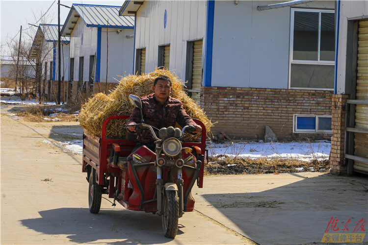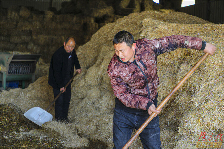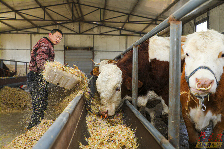 ↑2月22日,西峰區(qū)肖金鎮(zhèn)牧隆專業(yè)養(yǎng)殖場(chǎng),養(yǎng)殖戶何京津正在給牛添加草料。