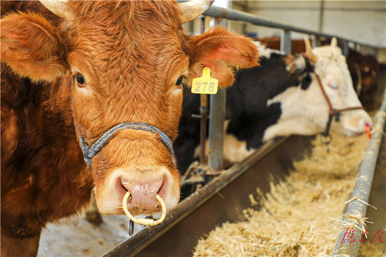 ↑牛舍里的西門塔爾、夏洛萊、利木贊等品種肉牛膘肥體壯。