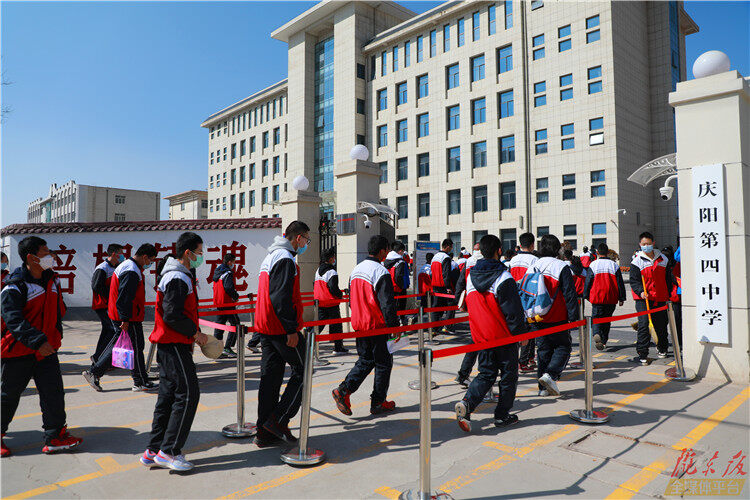 ↑慶陽第三中學的學生通過測溫門進入校園。