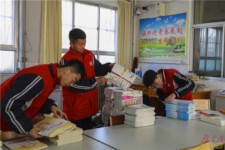 ↑慶陽第三中的學生正在分發(fā)新學期教材。