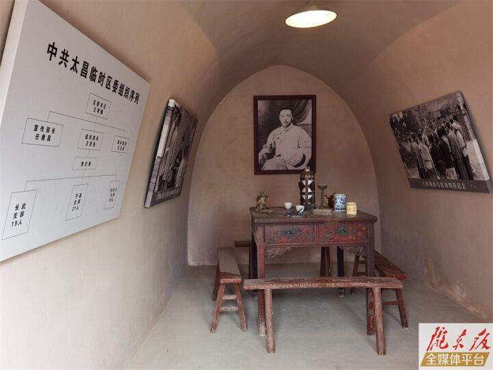 黨旗一側(cè)是三孔樸素的窯洞,是當時青年社、中共邠寧支部和太昌臨時區(qū)委的辦公地點,窯洞內(nèi)懸掛著老照片,擺放著老物件,還原了王孝錫和任鼎昌、王曉時、王之經(jīng)等革命先輩們點燃慶陽大地革命烽火、傳播馬克思主義的一些場景。