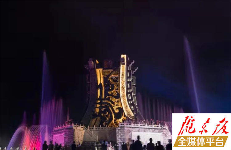 慶城縣南門周禮廣場銅鼎名為“鳳舞九天”,夜間有燈光和噴泉伴隨音樂律動,人們在此觀賞游玩、休憩納涼(2017年9月25日攝)。