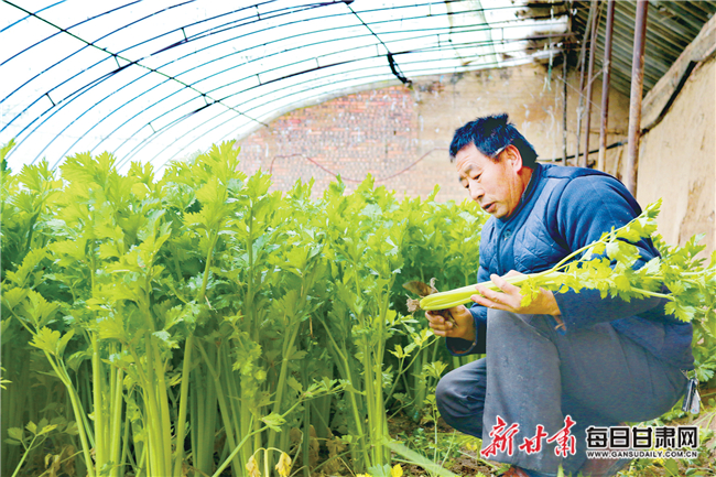 崇信縣錦屏鎮(zhèn)野雀村菜農(nóng)在大棚內(nèi)收割芹菜。