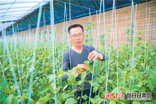 在崆峒區(qū)安國(guó)鎮(zhèn)土橋村蔬菜種植基地內(nèi),菜農(nóng)在給辣椒吊蔓。姚志強(qiáng)