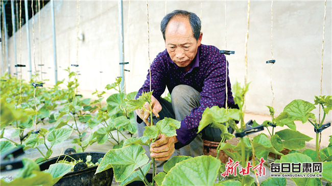 靜寧縣界石鋪鎮(zhèn)李堡村菜農(nóng)在給黃瓜苗搭架、整枝。