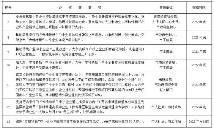 清單提出,制定出臺(tái)《慶陽(yáng)市落實(shí)進(jìn)一步加大對(duì)中小企業(yè)紓困幫扶力度的若干措施》和《慶陽(yáng)市貫徹落實(shí)甘肅省提升中小企業(yè)競(jìng)爭(zhēng)力若干措施實(shí)施細(xì)則》,幫助中小企業(yè)紓困解難;為“專精特新”中小企業(yè)建立“一戶一檔”成長(zhǎng)檔案,全面實(shí)施“一戶一策”精準(zhǔn)服務(wù),確保稅收優(yōu)惠政策應(yīng)享盡享;建立“專精特新”中小企業(yè)名單推送共享機(jī)制,開展“專精特新”中小企業(yè)銀企對(duì)接活動(dòng),全年為全市“專精特新”中小企業(yè)融資5000萬(wàn)元以上。