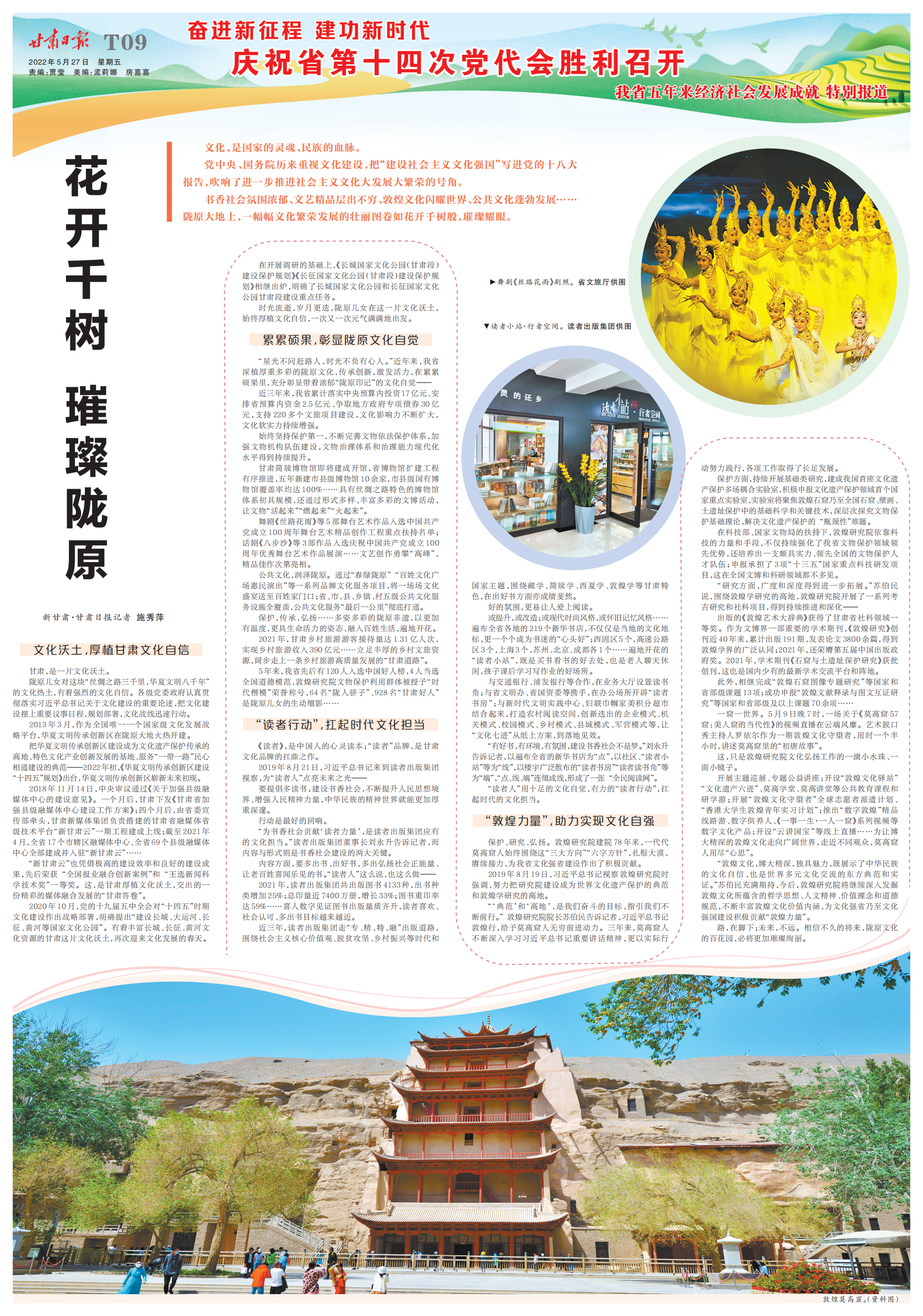 書香社會氛圍濃郁、文藝精品層出不窮、敦煌文化閃耀世界、公共文化蓬勃發(fā)展……隴原大地上,一幅幅文化繁榮發(fā)展的壯麗圖卷如花開千樹般,璀璨耀眼。