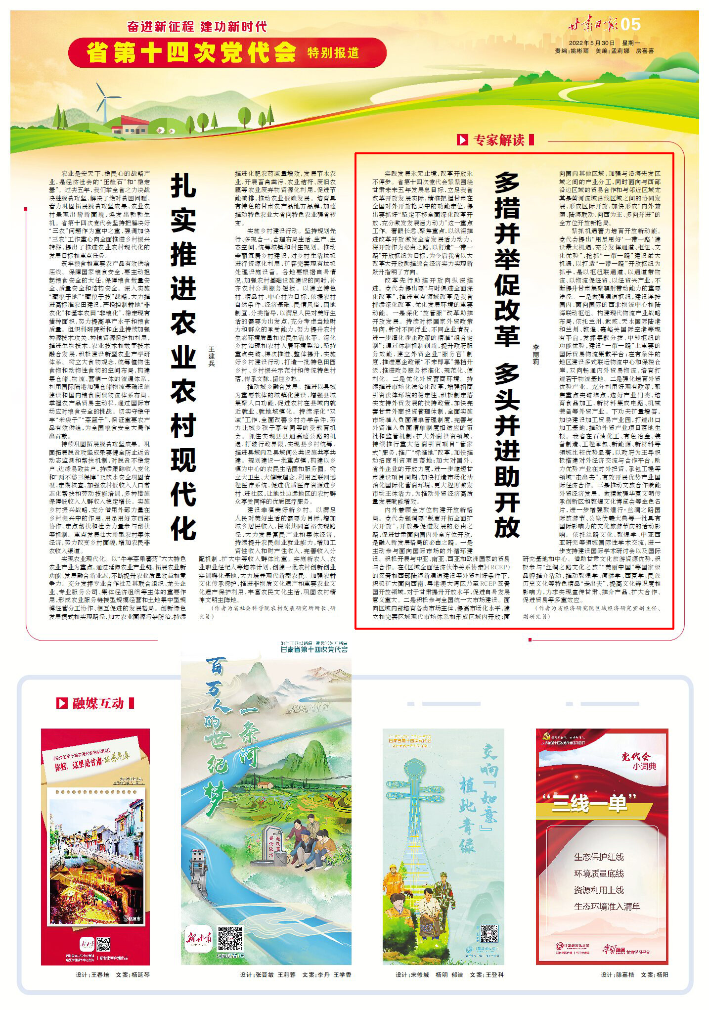 實(shí)踐發(fā)展永無止境,改革開放永不停步。省第十四次黨代會(huì)緊緊圍繞甘肅未來五年發(fā)展總目標(biāo),立足我省改革開放發(fā)展實(shí)際,精準(zhǔn)把握甘肅在全國對(duì)外開放格局中的功能定位,提出要抓好“堅(jiān)定不移全面深化改革開放,充分激發(fā)發(fā)展活力動(dòng)力”這一重點(diǎn)工作。著眼長遠(yuǎn)、聚焦重點(diǎn),以縱深推進(jìn)改革開放激發(fā)全省發(fā)展活力動(dòng)力,將開放作為必由之路,以打造“一帶一路”開放樞紐為目標(biāo),為今后我省以大改革大開放助推綜合經(jīng)濟(jì)實(shí)力實(shí)現(xiàn)新躍升指明了方向。