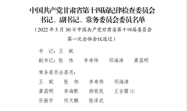中國(guó)共產(chǎn)黨甘肅省第十四屆紀(jì)律檢查委員會(huì)書(shū)記、副書(shū)記、常務(wù)委員會(huì)委員名單