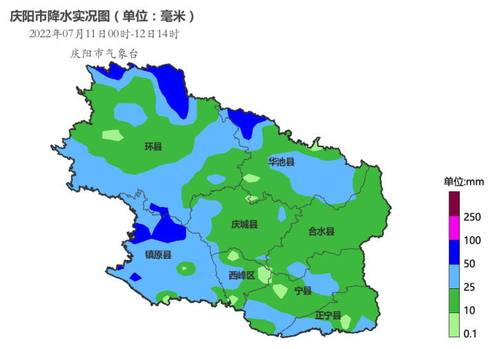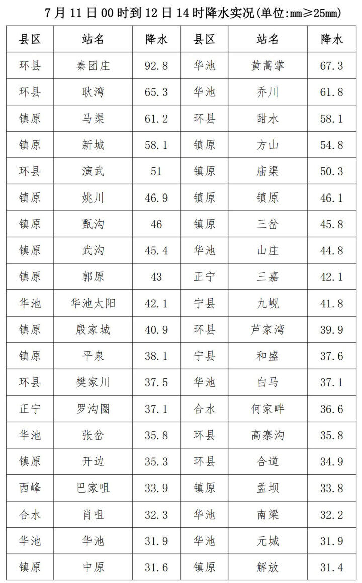 11日凌晨到傍晚、12日白天慶陽市出現(xiàn)了強(qiáng)降水天氣過程,截至12日14時,最大降水量出現(xiàn)在環(huán)縣秦團(tuán)莊92.8mm,最大小時降水量環(huán)縣甜水45.7mm(11日7-8 時)。各縣區(qū)降水量如下:西峰29.6mm、環(huán)縣13.4mm、華池31.9mm、慶城16.3mm、鎮(zhèn)原46.1mm、合水15.9mm、寧縣14.2mm、正寧19.1mm。詳細(xì)降水量如圖表: