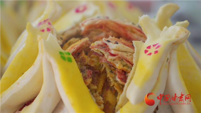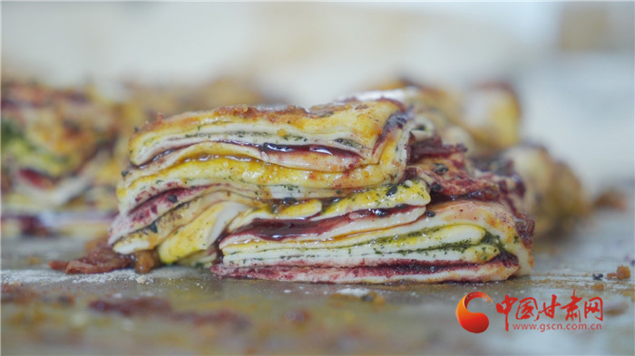 記者走進(jìn)榆中縣金崖鎮(zhèn)浩燕饅頭店,一股濃濃的胡麻油、玫瑰醬、香豆等混合的香氣撲面而來,李浩燕正在忙碌地趕制一批榆中傳統(tǒng)手工月餅。案板上除了發(fā)好的面團(tuán),還擺上了炒胡麻碎、姜黃、白砂糖等豐富的佐料。只見李浩燕從揉面開始,然后鋪餡、搟制、卷面、切分、披花,一道道工序一氣呵成。經(jīng)過一個(gè)多小時(shí),新鮮美味的月餅出爐了,切開后,內(nèi)里豐富,色彩斑斕,咬上一口軟糯可口,回味留香。