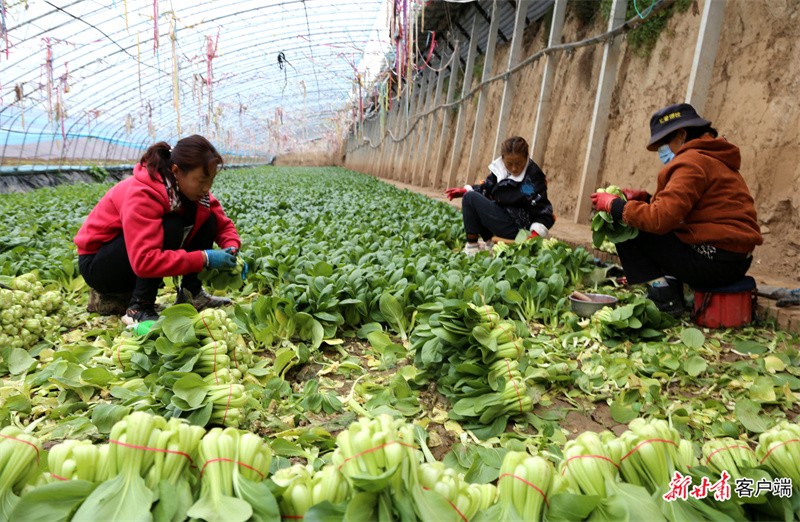 西峰區(qū)肖金設施蔬菜基地種植戶采收油菜。