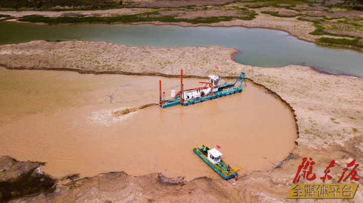 隨著機械的轟鳴聲,清淤船船頭大型支架下懸掛的錐形刀頭緩緩深入水中,快速旋轉,淤泥被刀頭絞碎后排入河槽,蒲河水不斷涌入,巴家咀水庫清淤工作順利推進。