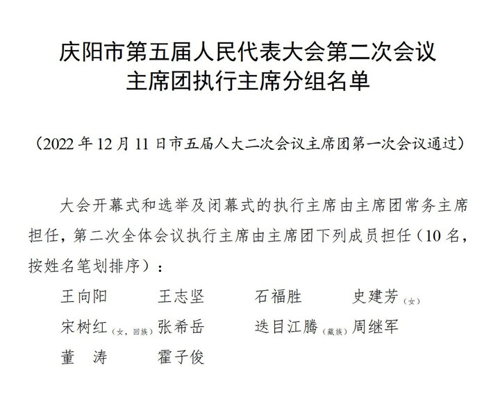 【受權(quán)發(fā)布】慶陽(yáng)市第五屆人民代表大會(huì)第二次會(huì)議主席團(tuán)執(zhí)行主席分組名單