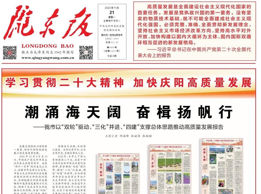 2021年12月8日至10日,中國共產(chǎn)黨慶陽市第五次代表大會(huì)隆重召開。站在“兩個(gè)一百年”的歷史交匯點(diǎn)上,放眼百年未有之大變局,市委立足慶陽經(jīng)濟(jì)社會(huì)發(fā)展的整體性特點(diǎn)和階段性特征,準(zhǔn)確把握慶陽在新發(fā)展格局中高質(zhì)量發(fā)展的方位坐標(biāo),明確了未來五年慶陽發(fā)展的總體思路:實(shí)施“雙輪”驅(qū)動(dòng),堅(jiān)持“三化”并進(jìn),強(qiáng)化“四建”支撐,走出一條革命老區(qū)高質(zhì)量發(fā)展的新路子。