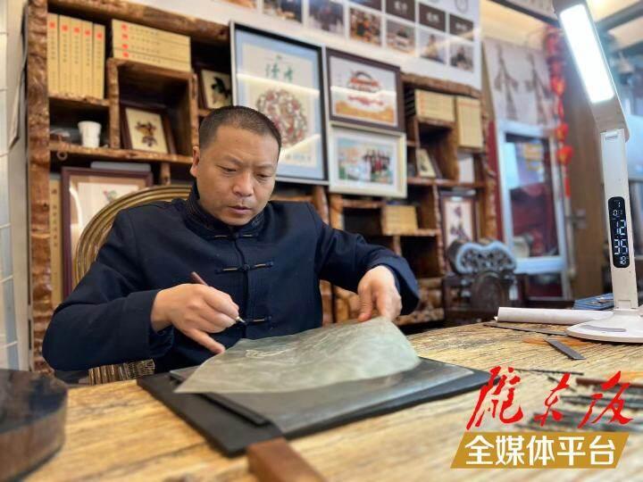 1月12日,在環(huán)州故城道情皮影館內,41歲的張治文伏于桌案,左手轉動牛皮,右手執(zhí)刀雕刻,十幾把刀在張治文手中來回轉換,鋒利的刀尖在牛皮上時而扎、時而推、時而鑿,經過四個多小時的精心打磨,一幅傳統(tǒng)皮影與現代潮流元素相融合的“年畫兔”栩栩如生地呈現了出來。