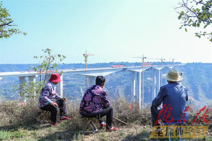 寧縣早勝鎮(zhèn)曹家村老人目睹甜永高速天寧溝大橋合龍。陳飛 攝